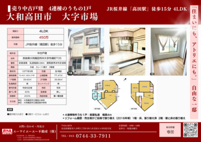 大和高田市市場|450万円の中古戸建4LDK|JR高田駅徒歩15分|DIY・投資用にもおすすめ